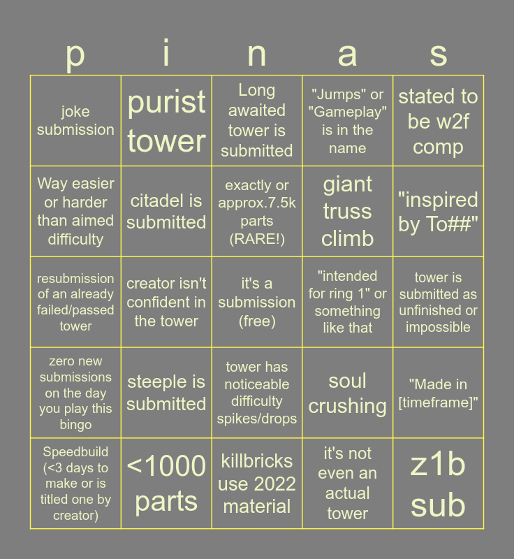 This bingo card has 1 images, a free space and 30 words: <1000 parts, "my first tower", creator isn't confident in the tower, APM library music, joke submission, Long awaited tower is submitted, citadel is submitted, tower has noticeable difficulty spikes/drops, "intended for ring 1" or something like that, killbricks use 2022 material, tower is submitted as unfinished or impossible, z1b sub, it's not even an actual tower, Megacollab (4+ builders), "inspired by To##", killbrick particles are still gray, soul crushing, zero new submissions on the day you play this bingo, steeple is submitted, stated to be w2f comp, resubmission of an already failed/passed tower, uses modern baseplate + modern lighting, purist tower, giant truss climb, Way easier or harder than aimed difficulty, "Jumps" or "Gameplay" is in the name, "Made in [timeframe]", Speedbuild (<3 days to make or is titled one by creator), exactly or approx.7.5k parts (RARE!) and features this typa jump.