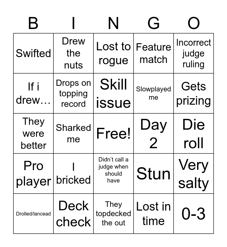 This bingo card has a free space and 24 words: I bricked, Deck check, Skill issue, Drolled/lancead, Incorrect judge ruling, Swifted, If i drew…, Drew the nuts, Day 2, Didn’t call a judge when should have, Slowplayed me, They were better, Stun, Very salty, Drops on topping record, Lost in time, Die roll, Lost to rogue, Gets prizing, Sharked me, 0-3, Pro player, Feature match and They topdecked the out.