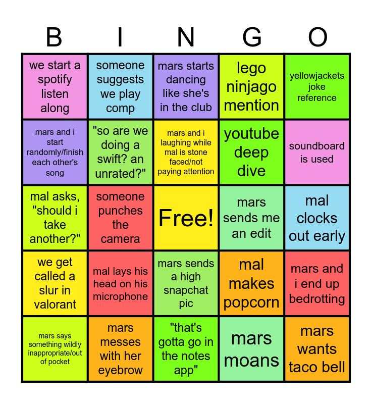 This bingo card has a free space and 24 words: mal lays his head on his microphone, mars messes with her eyebrow, mars and i laughing while mal is stone faced/not paying attention, mars says something wildly inappropriate/out of pocket, yellowjackets joke reference, we start a spotify listen along, mars and i start randomly/finish each other's song, someone suggests we play comp, mars sends me an edit, mars sends a high snapchat pic, youtube deep dive, mal asks, "should i take another?", mal makes popcorn, mars and i end up bedrotting, "so are we doing a swift? an unrated?", mars moans, mal clocks out early, mars starts dancing like she's in the club, soundboard is used, someone punches the camera, mars wants taco bell, we get called a slur in valorant, lego ninjago mention and "that's gotta go in the notes app".
