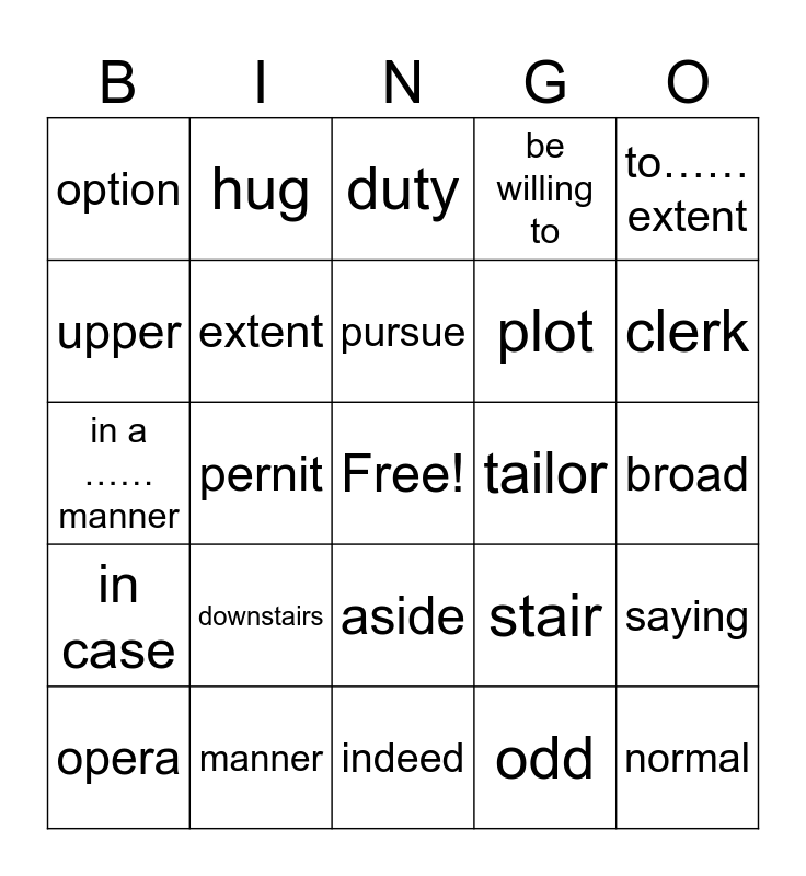 This bingo card has a free space and 34 words: postpone, odd, intention, nowhere, in case, extent, to……extent, opera, hug, dinosaur, pursue, duty, hesitate, eventually, tailor, clerk, manner, in a ……manner, downstairs, stair, aside, in that case, option, broad, indeed, normal, be willing to, element, plot, upper, maintain, pernit, saying and external.