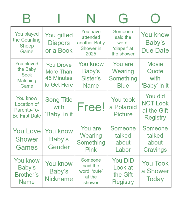 This bingo card has a free space and 24 words: You know Baby’s Gender, You know Baby’s Nickname, You know Baby’s Sister’s Name, You know Baby’s Brother’s Name, You know Baby’s Due Date, You played the Counting Sheep Game, You played the Baby Sock Matching Game, You gifted Diapers or a Book, You took a Polaroid Picture, You are Wearing Something Pink, You are Wearing Something Blue, You know Location of Parents-To-Be First Date, Someone talked about Labor, Someone talked about Cravings, You Drove More Than 45 Minutes to Get Here, You DID Look at the Gift Registry, You did NOT Look at the Gift Registry, You have attended another Baby Shower in 2025, Movie Quote with ‘Baby’ in it, Song Title with ‘Baby’ in it, You Took a Shower Today, You Love Shower Games, Someone said the word, ‘diaper’ at the shower and Someone said the word, ‘cute’ at the shower.