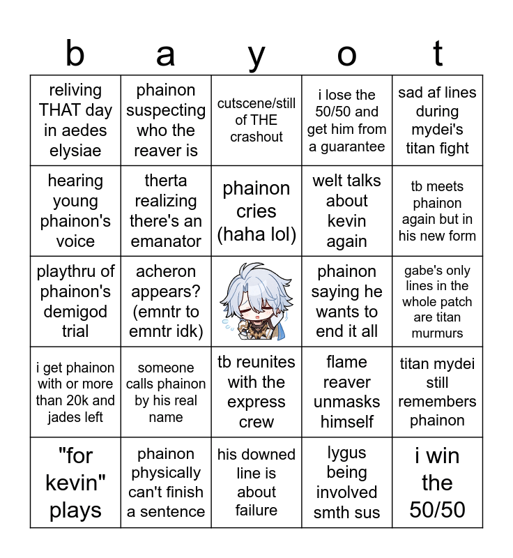 This bingo card has a free space and 24 words: someone calls phainon by his real name, phainon physically can't finish a sentence, phainon cries (haha lol), "for kevin" plays, sad af lines during mydei's titan fight, reliving THAT day in aedes elysiae, hearing young phainon's voice, phainon suspecting who the reaver is, phainon saying he wants to end it all, tb reunites with the express crew, welt talks about kevin again, playthru of phainon's demigod trial, flame reaver unmasks himself, titan mydei still remembers phainon, therta realizing there's an emanator, lygus being involved smth sus, gabe's only lines in the whole patch are titan murmurs, cutscene/still of THE crashout, tb meets phainon again but in his new form, acheron appears? (emntr to emntr idk), i win the 50/50, i get phainon with or more than 20k and jades left, i lose the 50/50 and get him from a guarantee and his downed line is about failure.
