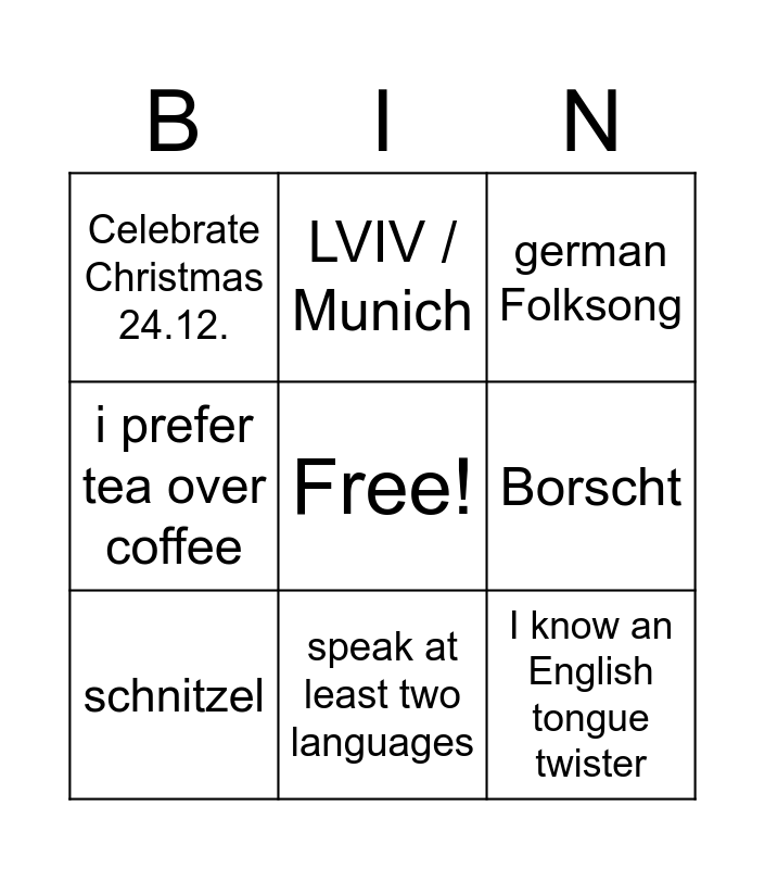 This bingo card has a free space and 8 words: Borscht, german Folksong, LVIV / Munich, schnitzel, Celebrate Christmas 24.12., I know an English tongue twister, i prefer tea over coffee and speak at least two languages.