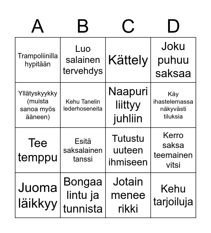 This bingo card has 16 words: Bongaa lintu ja tunnista, Kerro saksa teemainen vitsi, Kättely, Trampoliinilla hypitään, Tee temppu, Luo salainen tervehdys, Tutustu uuteen ihmiseen, Jotain menee rikki, Yllätyskyykky (muista sanoa myös ääneen), Kehu Tanelin lederhoseneita, Juoma läikkyy, Joku puhuu saksaa, Esitä saksalainen tanssi, Käy ihastelemassa näkyvästi tiluksia, Naapuri liittyy juhliin and Kehu tarjoiluja.
