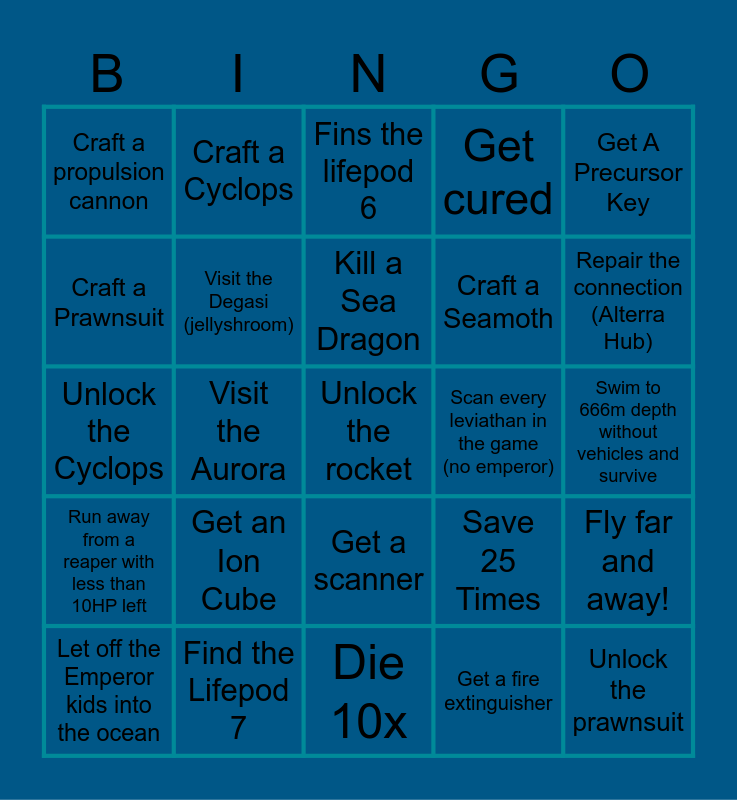 This bingo card has 30 words: Find the Lifepod 7, Get a lasercutter, Visit the Aurora, Kill a reaper leviathan, Craft a propulsion cannon, Fins the lifepod 6, Visit the Degasi (jellyshroom), Get a scanner, Scan every leviathan in the game (no emperor), Die 10x, Swim to 666m depth without vehicles and survive, Unlock the rocket, Get a fire extinguisher, Unlock the prawnsuit, Repair the connection (Alterra Hub), Get your first package (Alterra Hub), Save 25 Times, Run away from a reaper with less than 10HP left, Get an Ion Cube, Get A Precursor Key, Unlock the Cyclops, Unlock the Seamoth, Craft a Cyclops, Craft a Seamoth, Craft a Prawnsuit, Get cured, Fly far and away!, Let off the Emperor kids into the ocean, Kill a Sea Dragon and Build the rocket.
