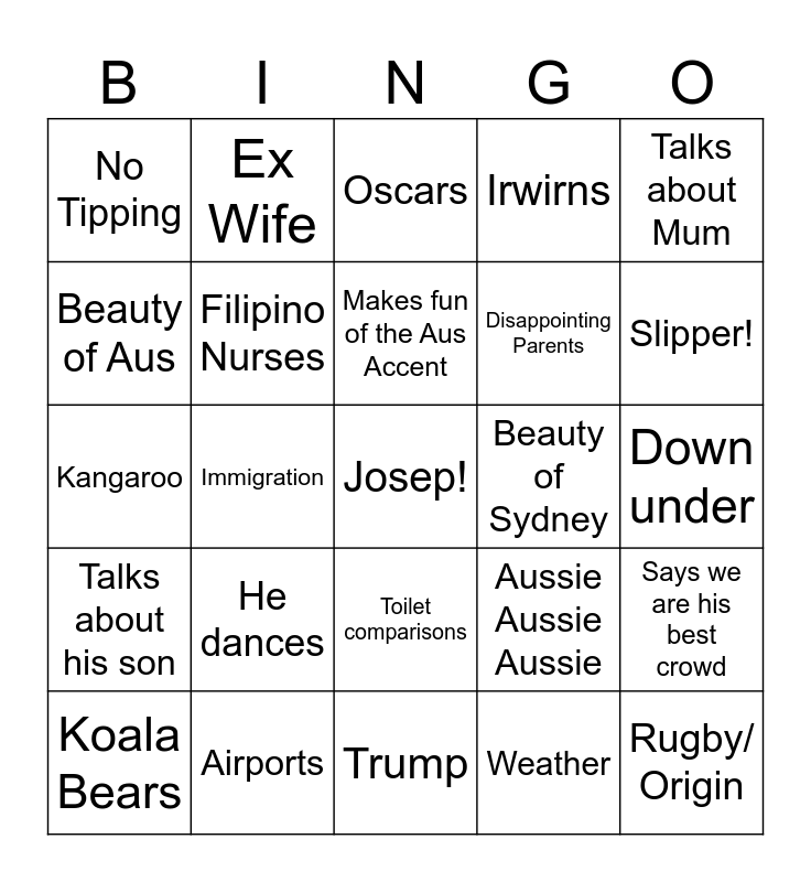 This bingo card has a free space and 24 words: He dances, Airports, Makes fun of the Aus Accent, Koala Bears, Talks about Mum, No Tipping, Beauty of Aus, Ex Wife, Beauty of Sydney, Toilet comparisons, Disappointing Parents, Kangaroo, Aussie Aussie Aussie, Says we are his best crowd, Filipino Nurses, Weather, Down under, Oscars, Slipper!, Immigration, Rugby/ Origin, Talks about his son, Irwirns and Trump.