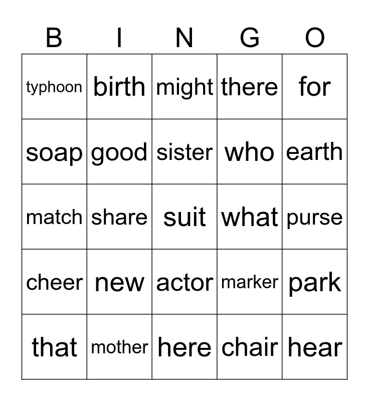 This bingo card has a free space and 24 words: new, mother, sister, that, for, typhoon, soap, birth, what, actor, who, match, marker, park, good, chair, purse, might, earth, share, hear, cheer, there and here.