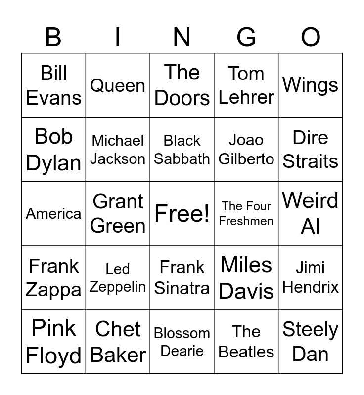 This bingo card has a free space and 24 words: Led Zeppelin, Chet Baker, Black Sabbath, Pink Floyd, Wings, Bill Evans, Bob Dylan, Queen, The Four Freshmen, Frank Sinatra, Joao Gilberto, America, Miles Davis, Jimi Hendrix, Michael Jackson, The Beatles, Weird Al, The Doors, Dire Straits, Grant Green, Steely Dan, Frank Zappa, Tom Lehrer and Blossom Dearie.