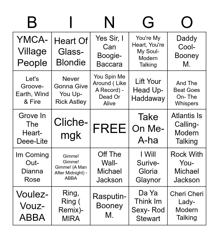 This bingo card has a free space and 49 words: September- Earth, Wind & Fire, Cheri Cheri Lady- Modern Talking, Dancing Queen- ABBA, Rasputin- Booney M., Gimme! Gimme! Gimme! (A Man After Midnight) - ABBA, What Is Love - 7" Mix, Heart Of Glass- Blondie, Stayin Alive- Bee Gees, Let's Groove- Earth, Wind & Fire, I Wanna Dance With Somebody- Whitney Houston, Never Gonna Give You Up- Rick Astley, You're My Heart, You're My Soul- Modern Talking, Rock With You- Michael Jackson, I Will Surive- Gloria Glaynor, Brother Louie- Modern Talking, Funky Town (Single Version) - Lipps Inc., You Spin Me Around ( Like A Record) - Dead Or Alive, Take On Me- A-ha, Boogie Wonderland- Earth, Wind & Fire, Daddy Cool- Booney M., Cliche- mgk, Da Ya Think Im Sexy- Rod Stewart, YMCA- Village People, Lift Your Head Up- Haddaway, Super Trouper- ABBA, And The Beat Goes On- The Whispers, Voulez- Vouz- ABBA, Give It To Me Babby- Rick James, Off The Wall- Michael Jackson, Im Coming Out- Dianna Rose, Everything She Wants- Wham!, Living On Video- Trans-X, Le Freak- CHIC, Its Raining Men- Weather Girls, Ring, Ring ( Remix)- MIRA, Last Night A Dj Saved My Life- Indeep, Yazoo, Blame It On The Boogie- Jackson, You're A Woman- Bad Boys Blue, Atlantis Is Calling- Modern Talking, Hot Stuff- Donna Summer, Stomp! Single Version- The Brothers Jackson, Alibi- Glitter Dream, Diana V, Alex Parker, December,1963- Frankie Valli & The Four Season, Your Love (Album Mix)- Lime, Grove In The Heart- Deee-Lite, Yes Sir, I Can Boogie- Baccara, I Just Wanna Be Your Everthing- Andy Gibb, Saturday Night- Whigfield and Teardrops- Womack & Womack.