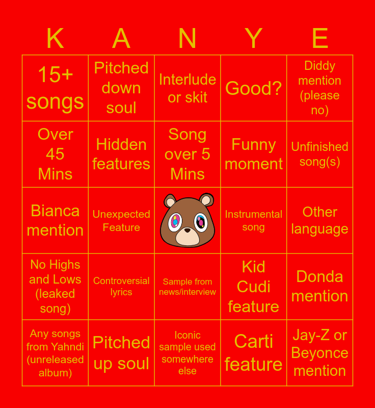 This bingo card has a free space and 24 words: Controversial lyrics, Pitched up soul, Song over 5 Mins, Any songs from Yahndi (unreleased album), Diddy mention (please no), 15+ songs, Over 45 Mins, Pitched down soul, Instrumental song, Sample from news/interview, Funny moment, Bianca mention, Kid Cudi feature, Donda mention, Hidden features, Carti feature, Other language, Interlude or skit, Unfinished song(s), Unexpected Feature, Jay-Z or Beyonce mention, No Highs and Lows (leaked song), Good? and Iconic sample used somewhere else.
