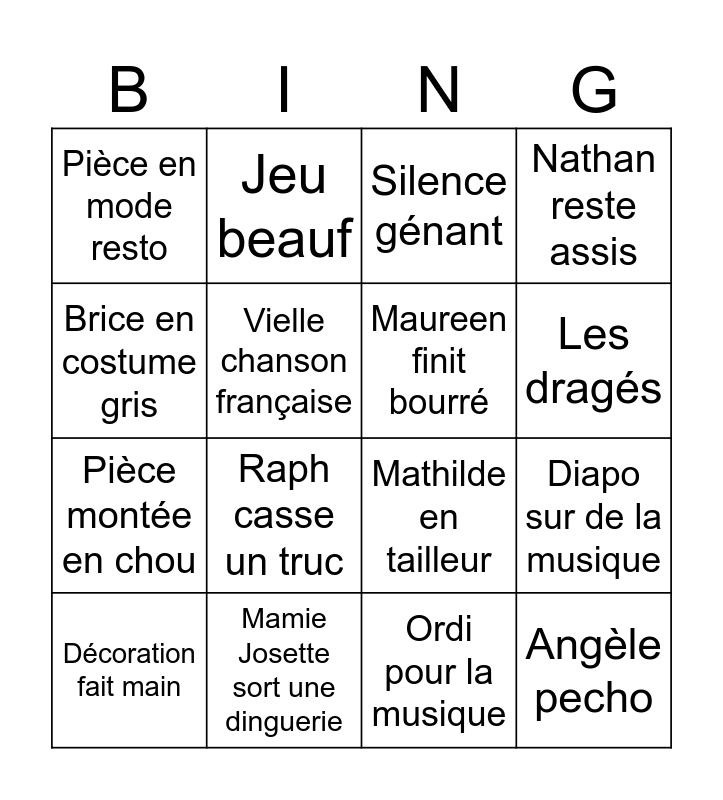 This bingo card has 16 words: Mamie Josette sort une dinguerie, Diapo sur de la musique, Silence génant, Pièce en mode resto, Pièce montée en chou, Jeu beauf, Mathilde en tailleur, Ordi pour la musique, Brice en costume gris, Vielle chanson française, Décoration fait main, Nathan reste assis, Raph casse un truc, Les dragés, Maureen finit bourré and Angèle pecho.