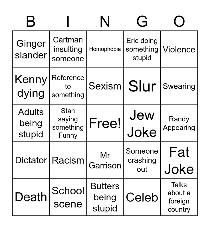 This bingo card has a free space and 24 words: Racism, School scene, Sexism, Death, Violence, Ginger slander, Kenny dying, Cartman insulting someone, Jew Joke, Mr Garrison, Slur, Adults being stupid, Someone crashing out, Fat Joke, Reference to something, Celeb, Randy Appearing, Homophobia, Swearing, Stan saying something Funny, Talks about a foreign country, Dictator, Eric doing something stupid and Butters being stupid.
