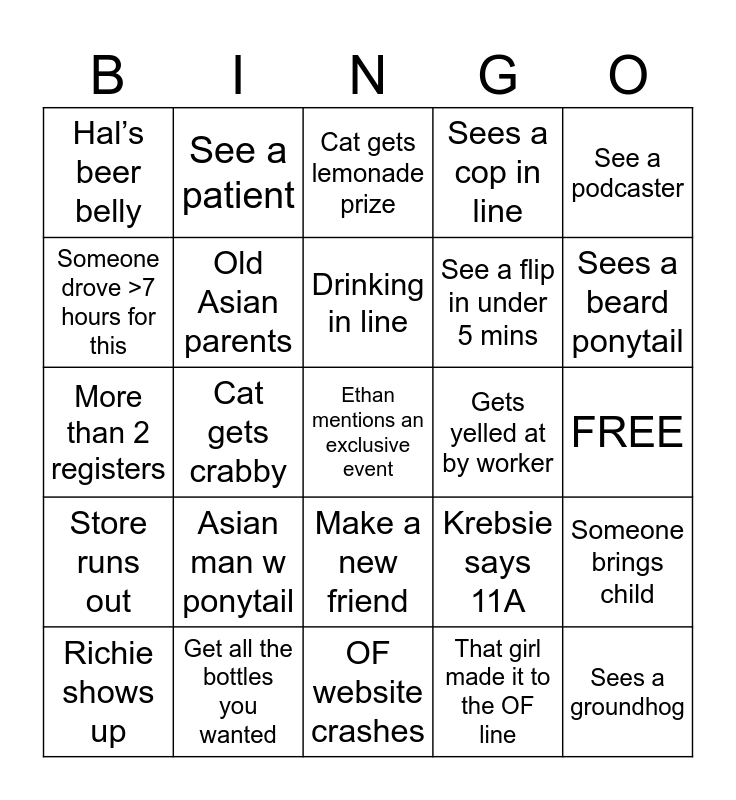 This bingo card has a free space and 24 words: Asian man w ponytail, Get all the bottles you wanted, Drinking in line, Richie shows up, See a podcaster, Hal’s beer belly, Someone drove >7 hours for this, See a patient, Gets yelled at by worker, Make a new friend, See a flip in under 5 mins, More than 2 registers, Krebsie says 11A, Someone brings child, Old Asian parents, That girl made it to the OF line, FREE, Cat gets lemonade prize, Sees a beard ponytail, Cat gets crabby, Sees a groundhog, Store runs out, Sees a cop in line and OF website crashes.