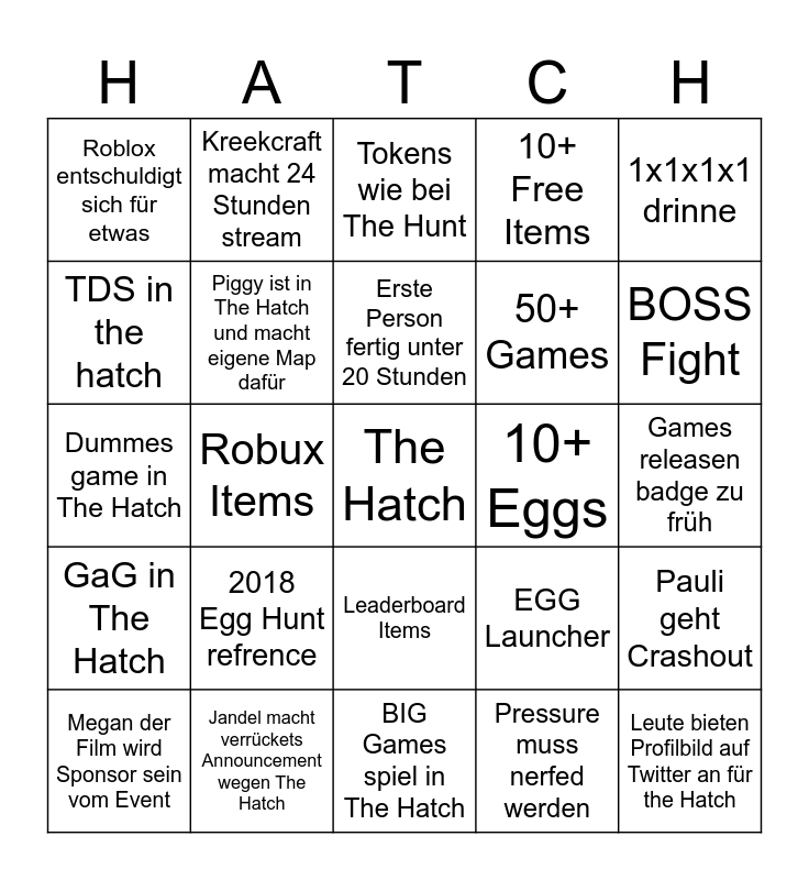 This bingo card has a free space and 24 words: 2018 Egg Hunt refrence, Jandel macht verrückets Announcement wegen The Hatch, Erste Person fertig unter 20 Stunden, Megan der Film wird Sponsor sein vom Event, 1x1x1x1 drinne, Roblox entschuldigt sich für etwas, TDS in the hatch, Kreekcraft macht 24 Stunden stream, 10+ Eggs, Leaderboard Items, 50+ Games, Dummes game in The Hatch, EGG Launcher, Pauli geht Crashout, Piggy ist in The Hatch und macht eigene Map dafür, Pressure muss nerfed werden, Games releasen badge zu früh, Tokens wie bei The Hunt, BOSS Fight, Robux Items, Leute bieten Profilbild auf Twitter an für the Hatch, GaG in The Hatch, 10+ Free Items and BIG Games spiel in The Hatch.
