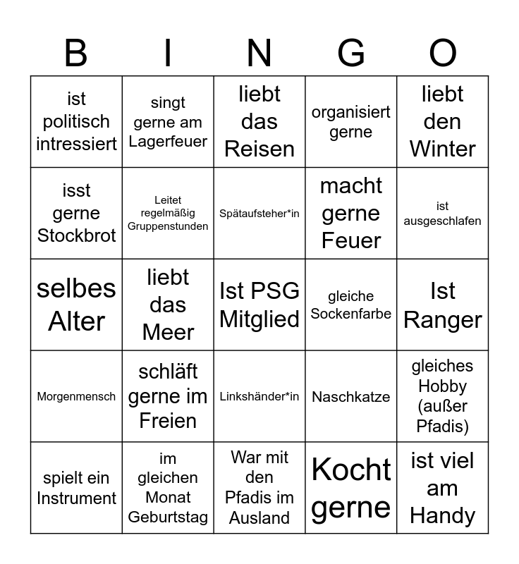 This bingo card has a free space and 34 words: Hat Haustiere, Kocht gerne, Ist seit Wichtel bei der PSG, Ist noch ganz neu bei der PSG, Morgenmensch, Leitet regelmäßig Gruppenstunden, liebt den Winter, spielt ein Instrument, singt gerne am Lagerfeuer, macht gerne Sport, Spätaufsteher*in, liebt das Reisen, liest gerne Bücher, gleicher Musikgeschmack, gleiche Sockenfarbe, ist ausgeschlafen, im gleichen Monat Geburtstag, selbes Alter, schläft gerne im Freien, Naschkatze, Linkshänder*in, ist dieses Jahr nochmal auf einem Zeltlager, ist politisch intressiert, Ist Ranger, War mit den Pfadis im Ausland, ist viel am Handy, organisiert gerne, spielt gerne (Brett-)Spiele, macht gerne Feuer, isst gerne Stockbrot, Hat eine Kluft an, liebt das Meer, gleiches Hobby (außer Pfadis) and bleibt gerne lang wach.