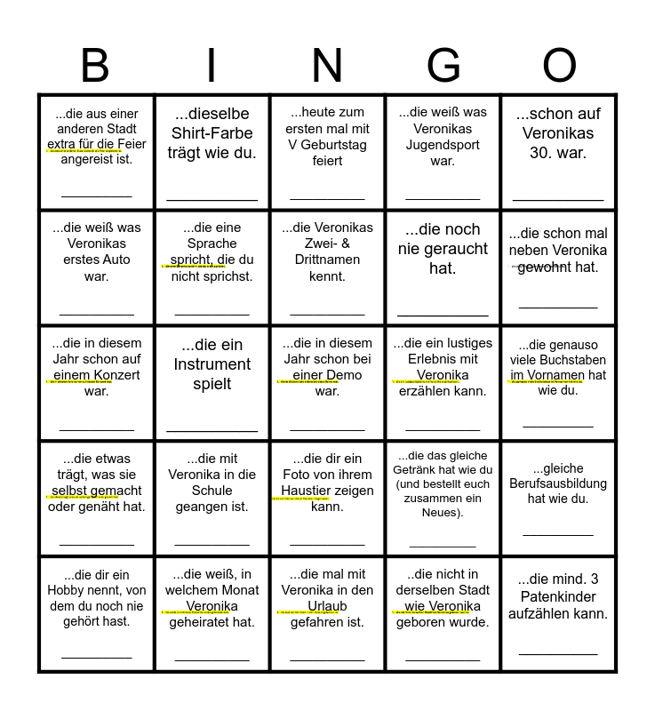 This bingo card has 12 images and 25 words: ...die mit Veronika in die Schule geangen ist. __________, ...die mal mit Veronika in den Urlaub gefahren ist. __________, ...die Veronikas Zwei- & Drittnamen kennt. __________, ...die dir ein Hobby nennt, von dem du noch nie gehört hast. __________, ...schon auf Veronikas 30. war. __________, ...die aus einer anderen Stadt extra für die Feier angereist ist. __________, ...die weiß was Veronikas erstes Auto war. __________, ...dieselbe Shirt-Farbe trägt wie du. __________, ...die ein lustiges Erlebnis mit Veronika erzählen kann. __________, ...die dir ein Foto von ihrem Haustier zeigen kann. __________, ...die noch nie geraucht hat. __________, ...die in diesem Jahr schon auf einem Konzert war. __________, ...die das gleiche Getränk hat wie du (und bestellt euch zusammen ein Neues). __________, ...gleiche Berufsausbildung hat wie du. __________, ...die eine Sprache spricht, die du nicht sprichst. __________, ...die mind. 3 Patenkinder aufzählen kann. __________, ...die genauso viele Buchstaben im Vornamen hat wie du. __________, ...heute zum ersten mal mit V Geburtstag feiert __________, ...die schon mal neben Veronika gewohnt hat. __________, ...die ein Instrument spielt __________, ...die in diesem Jahr schon bei einer Demo war. __________, ...die weiß, in welchem Monat Veronika geheiratet hat. __________, ...die etwas trägt, was sie selbst gemacht oder genäht hat. __________, ...die weiß was Veronikas Jugendsport war. __________ and ..die nicht in derselben Stadt wie Veronika geboren wurde. __________.