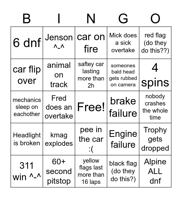 This bingo card has a free space and 24 words: 311 win ^-^, kmag explodes, saftey car lasting more than 2h, black flag (do they do this?), red flag (do they do this??), 6 dnf, Jenson ^-^, car on fire, brake failure, nobody crashes the whole time, mechanics sleep on eachother, animal on track, Engine failure, Trophy gets dropped, car flip over, 60+ second pitstop, yellow flags last more than 16 laps, Mick does a sick overtake, 4 spins, Headlight is broken, Fred does an overtake, pee in the car :(, someones bald head gets rubbed on camera and Alpine ALL dnf.
