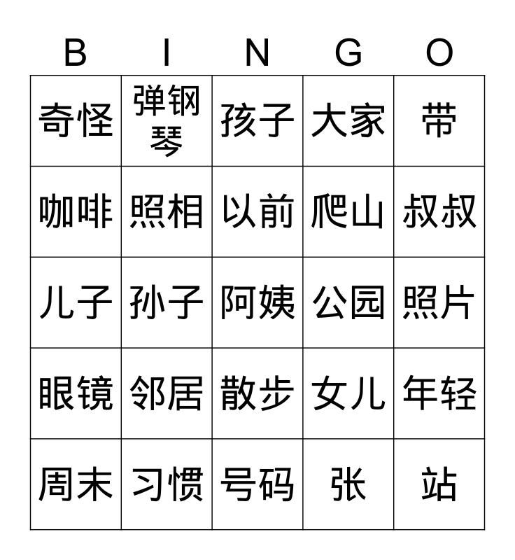 This bingo card has a free space and 24 words: 邻居, 习惯, 以前, 周末, 带, 奇怪, 咖啡, 弹钢琴, 公园, 散步, 爬山, 儿子, 女儿, 年轻, 照相, 张, 照片, 孩子, 叔叔, 孙子, 站, 眼镜, 大家 and 号码.