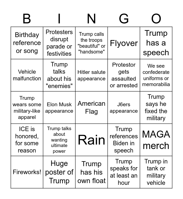 This bingo card has a free space and 24 words: Trump talks about wanting ultimate power, Huge poster of Trump, Hitler salute appearance, Fireworks!, Trump has a speech, Birthday reference or song, Vehicle malfunction, Protesters disrupt parade or festivities, J6ers appearance, Rain, Protestor gets assaulted or arrested, Trump wears some military-like apparel, Trump references Biden in speech, MAGA merch, Trump talks about his "enemies", Trump speaks for at least an hour, Trump says he fixed the military, Trump calls the troops "beautiful" or "handsome", We see confederate uniforms or memorabilia, Elon Musk appearance, Trump in tank or military vehicle, ICE is honored, for some reason, Flyover and Trump has his own float.