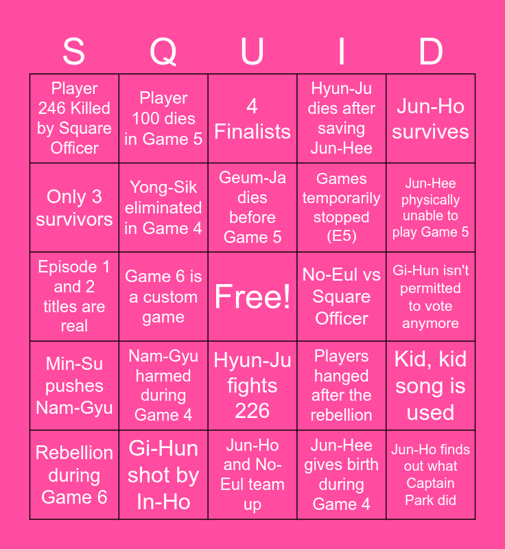 This bingo card has a free space and 24 words: Nam-Gyu harmed during Game 4, Gi-Hun shot by In-Ho, Geum-Ja dies before Game 5, Rebellion during Game 6, Jun-Ho survives, Player 246 Killed by Square Officer, Only 3 survivors, Player 100 dies in Game 5, No-Eul vs Square Officer, Hyun-Ju fights 226, Games temporarily stopped (E5), Episode 1 and 2 titles are real, Players hanged after the rebellion, Kid, kid song is used, Yong-Sik eliminated in Game 4, Jun-Hee gives birth during Game 4, Gi-Hun isn't permitted to vote anymore, 4 Finalists, Jun-Hee physically unable to play Game 5, Game 6 is a custom game, Jun-Ho finds out what Captain Park did, Min-Su pushes Nam-Gyu, Hyun-Ju dies after saving Jun-Hee and Jun-Ho and No-Eul team up.