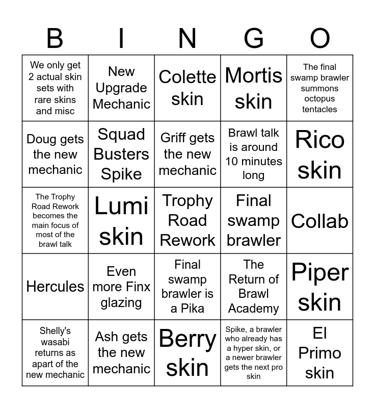 This bingo card has a free space and 24 words: Even more Finx glazing, Ash gets the new mechanic, Griff gets the new mechanic, Shelly's wasabi returns as apart of the new mechanic, The final swamp brawler summons octopus tentacles, We only get 2 actual skin sets with rare skins and misc, Doug gets the new mechanic, New Upgrade Mechanic, Final swamp brawler, Final swamp brawler is a Pika, Brawl talk is around 10 minutes long, The Trophy Road Rework becomes the main focus of most of the brawl talk, The Return of Brawl Academy, Piper skin, Squad Busters Spike, Spike, a brawler who already has a hyper skin, or a newer brawler gets the next pro skin, Collab, Colette skin, Rico skin, Lumi skin, El Primo skin, Hercules, Mortis skin and Berry skin.