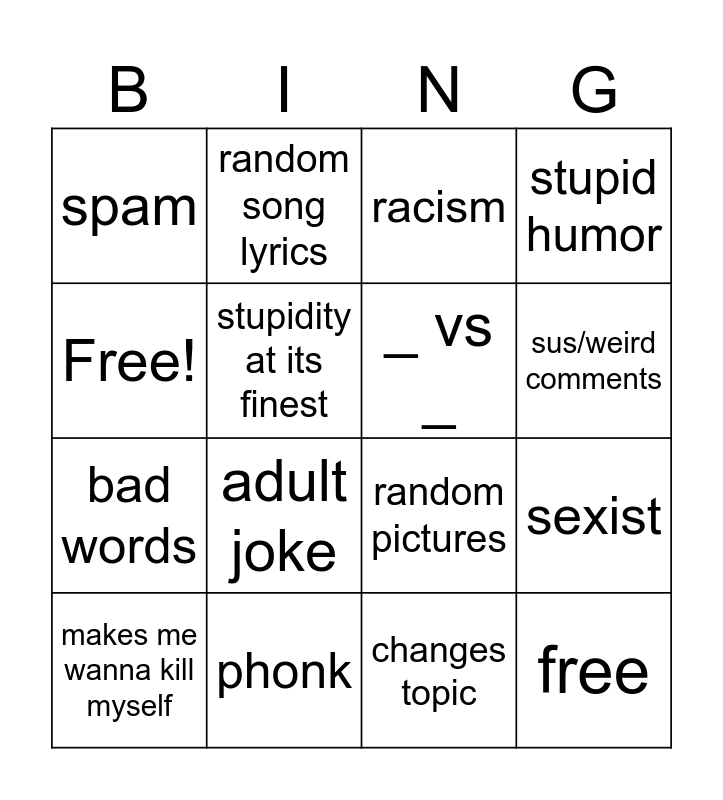 This bingo card has 16 words: phonk, sexist, racism, spam, bad words, random song lyrics, random pictures, changes topic, Free!, stupidity at its finest, makes me wanna kill myself, stupid humor, adult joke, sus/weird comments, _ vs _ and free.