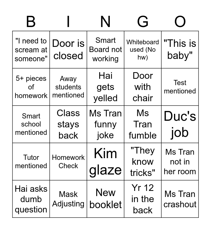 This bingo card has a free space and 24 words: Homework Check, Mask Adjusting, Hai gets yelled, Hai asks dumb question, "This is baby", "I need to scream at someone", 5+ pieces of homework, Door is closed, Ms Tran fumble, Kim glaze, Door with chair, Smart school mentioned, "They know tricks", Ms Tran not in her room, Away students mentioned, Yr 12 in the back, Duc's job, Smart Board not working, Test mentioned, Class stays back, Ms Tran crashout, Tutor mentioned, Whiteboard used (No hw) and New booklet.