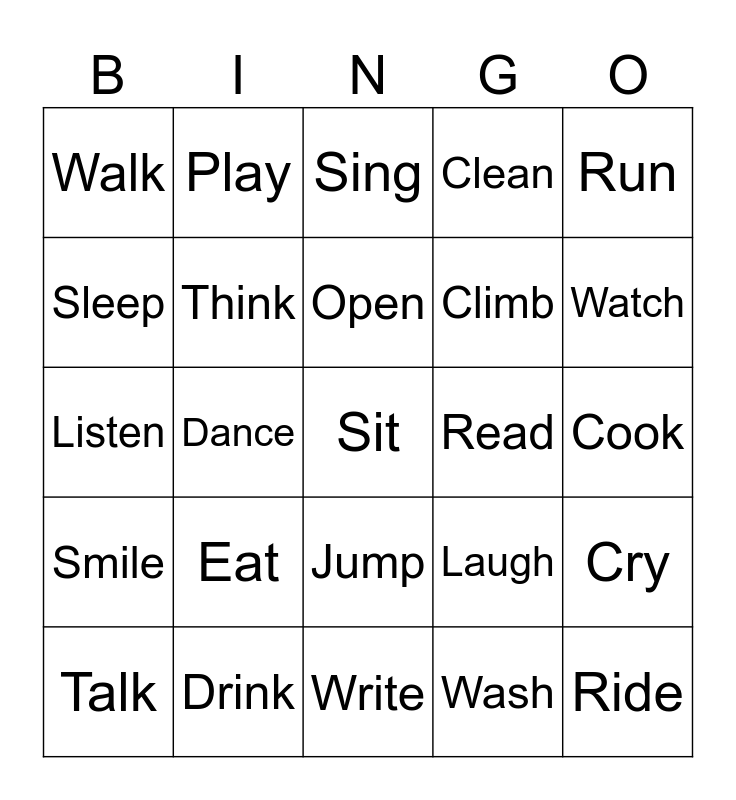 This bingo card has a free space and 24 words: Eat, Drink, Open, Talk, Run, Walk, Sleep, Play, Read, Jump, Climb, Listen, Laugh, Cry, Think, Wash, Cook, Sing, Watch, Dance, Ride, Smile, Clean and Write.