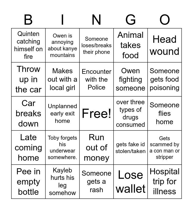 This bingo card has a free space and 24 words: Toby forgets his underwear somewhere., Kayleb hurts his leg somehow, Encounter with the Police, Pee in empty bottle, Head wound, Quinten catching himself on fire, Throw up in the car, Owen is annoying about kanye mountains, over three types of drugs consumed, Run out of money, Owen fighting someone, Car breaks down, gets fake id stolen/taken, Gets scammed by a con man or stripper, Makes out with a local girl, Lose wallet, Someone flies home, Someone loses/breaks their phone, Someone gets food poisoning, Unplanned early exit home, Hospital trip for illness, Late coming home, Animal takes food and Someone gets a rash.