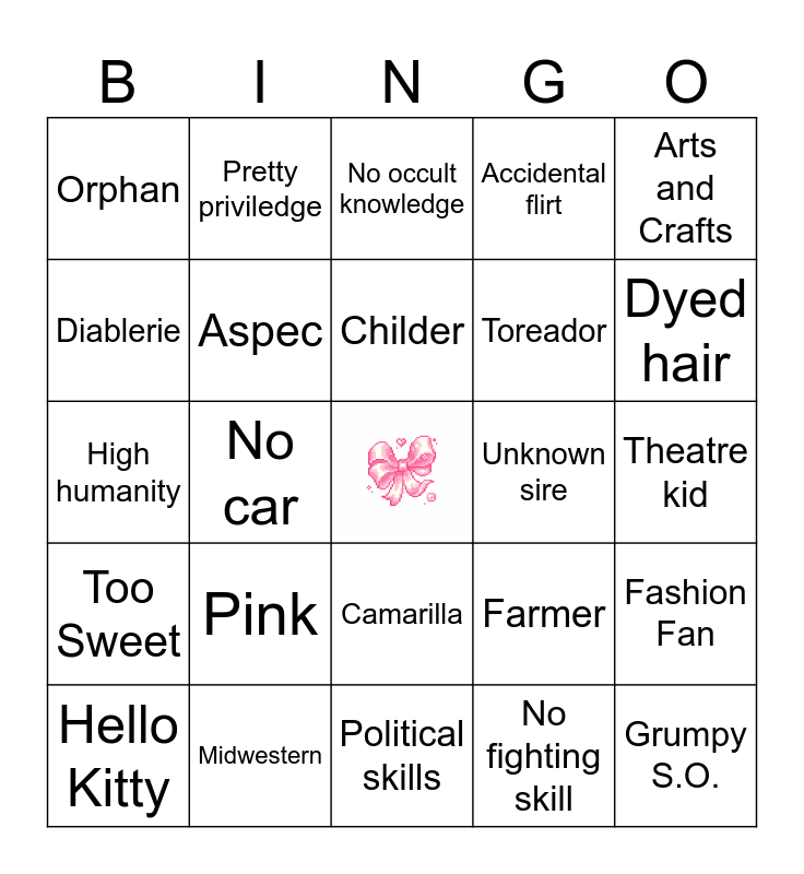 This bingo card has a free space and 24 words: Pink, Midwestern, Childer, Hello Kitty, Arts and Crafts, Orphan, Diablerie, Pretty priviledge, Unknown sire, Camarilla, Toreador, High humanity, Farmer, Fashion Fan, Aspec, No fighting skill, Theatre kid, No occult knowledge, Dyed hair, No car, Grumpy S.O., Too Sweet, Accidental flirt and Political skills.