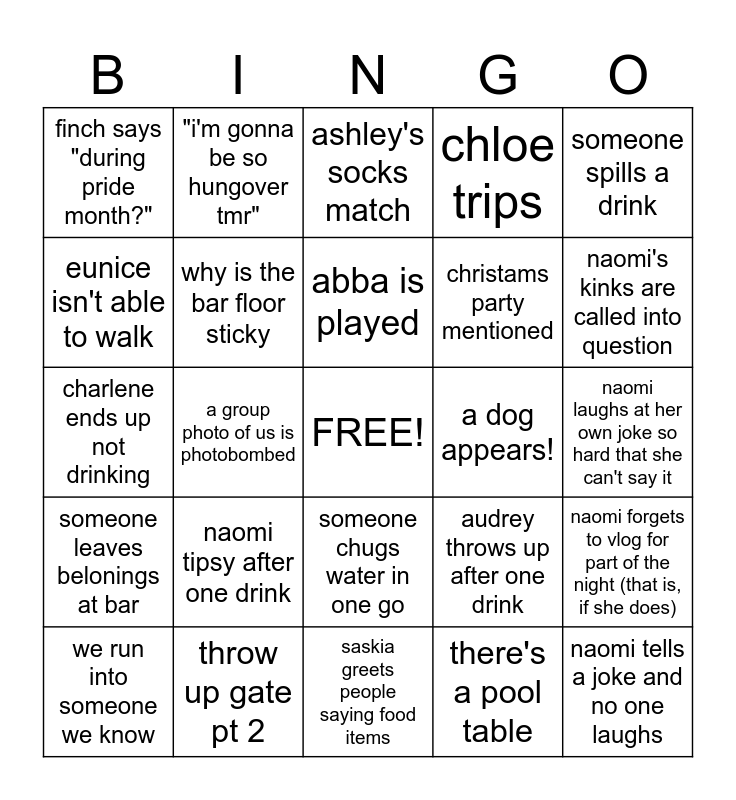 This bingo card has a free space and 24 words: naomi tipsy after one drink, throw up gate pt 2, abba is played, we run into someone we know, someone spills a drink, finch says "during pride month?", eunice isn't able to walk, "i'm gonna be so hungover tmr", a dog appears!, someone chugs water in one go, christams party mentioned, charlene ends up not drinking, audrey throws up after one drink, naomi forgets to vlog for part of the night (that is, if she does), why is the bar floor sticky, there's a pool table, naomi laughs at her own joke so hard that she can't say it, ashley's socks match, naomi's kinks are called into question, a group photo of us is photobombed, naomi tells a joke and no one laughs, someone leaves belonings at bar, chloe trips and saskia greets people saying food items.