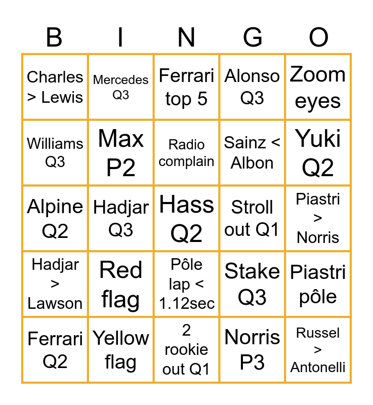 This bingo card has a free space and 24 words: Red flag, Yellow flag, Radio complain, Ferrari Q2, Zoom eyes, Charles > Lewis, Williams Q3, Mercedes Q3, Stroll out Q1, Pôle lap < 1.12sec, Sainz < Albon, Alpine Q2, Stake Q3, Piastri pôle, Max P2, Norris P3, Piastri > Norris, Ferrari top 5, Yuki Q2, Hadjar Q3, Russel > Antonelli, Hadjar > Lawson, Alonso Q3 and 2 rookie out Q1.