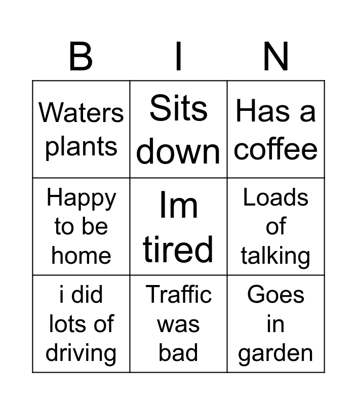 This bingo card has a free space and 8 words: Loads of talking, Has a coffee, Sits down, i did lots of driving, Waters plants, Goes in garden, Happy to be home and Traffic was bad.