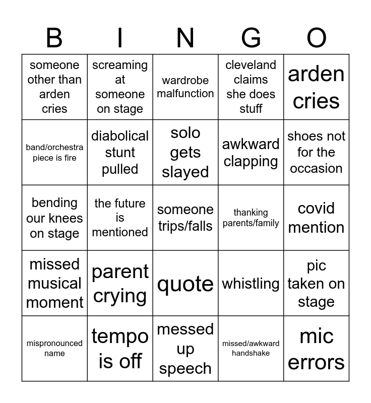This bingo card has 25 words: parent crying, messed up speech, solo gets slayed, mispronounced name, arden cries, someone other than arden cries, band/orchestra piece is fire, screaming at someone on stage, thanking parents/family, quote, awkward clapping, bending our knees on stage, whistling, pic taken on stage, diabolical stunt pulled, mic errors, covid mention, wardrobe malfunction, shoes not for the occasion, the future is mentioned, someone trips/falls, tempo is off, missed musical moment, cleveland claims she does stuff and missed/awkward handshake.