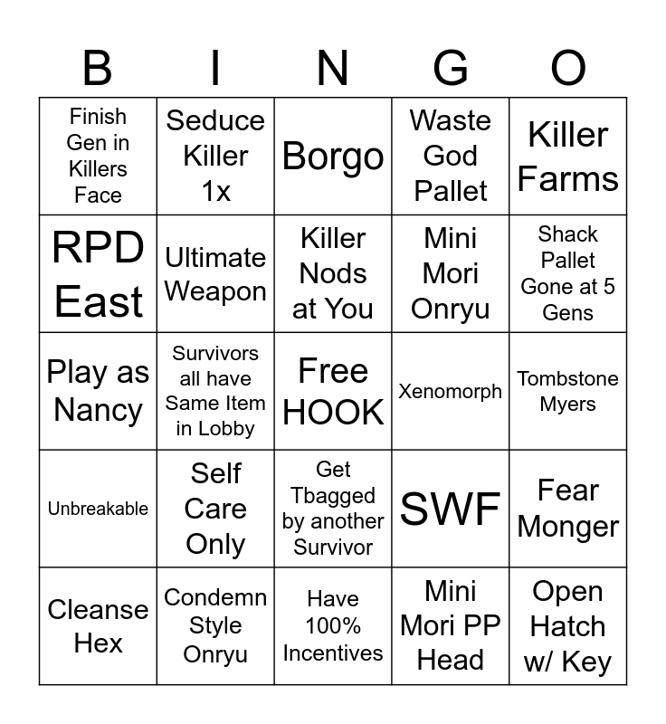 This bingo card has a free space and 184 words: Successful DS, Successful DH, Cleanse Hex, Pain Res, Pop, Franklins, Tunneled, Camped, Mori'd by Offering, Hit on Hook, 2+ People Slugged, Slugged for 4K, Left Behind at Endgame, Humped by Killer, Killer Nods at You, Killer Shakes Head at You, Open Basement Chest, Open All Chests, Open A Chest, Cleanse all Totems, FTP Someone, Sabo Hook, Blast Mine Value, Pallet Save, Flashie Save, Flashbang Save, Leave Via Hatch, Killer Plays with Pebble, Head On Killer 3X, Deliverance, Killer DCs, Server Crashes, TTV Survivor, TTV Killer, Anon Survivor, Anon Killer, P100 Survivor, P100 Killer, Sandbagged by Survivor, Urban Evade All Match, Loop for 1 Gen, 5 Gen Chase, Killer Has Aura Perk/Add On, Killer Has Puppers Charm, Killer has Pride Charm, Killer Farms, Basement Hook Sacrifice, Back Hook, All Gens Finished, Open Exit Gate, Condemn Style Onryu, Mini Mori Pig, Mini Mori PP Head, Mini Mori Onryu, Hit by Hatchet, Exposed, Bless a Hex, Full Boon Build, Self Care Only Heals, No Mither Run, Power Struggle Value, Wiggle Free, Borgo, RPD East, RPD West, Map w/ Bed, Killer Brings Map Offering, Killer has Iri Add On, Black Ward, Sacrificial Ward Offering, Anniversary Cake, 2+ Blood Party Streamers, Seduce Killer 1x, Die on first hook, 2nd Stage first hook, Hooked b4 First Gen pops, Bleed Out, All Same Survivor, Killer Deadzones, First Out, No Hook Escape, No Downed Escape, Full Exhaustion Build, NoEd, Take 3 Protection Hits, Escape with Object of Obsession, True 4% Represent, Caught in Trappers Trap, Get 3 Pallet Stuns in one match, Full Auto Didact Stack, Lose All Distortion Tokens, Successfully 360 Killer, Boon Hex Totem, Dodge M1, Dodge M2, Moonwalk, Unbreakable, Another Survivor Plot Twists, Play as Nic Cage, Scoops Ahoy Steve, James Sunderland, Spies from Shadows, Disturb 5 Crows in One Match, Ultimate Weapon, Sloppy Butcher, Insidious, Bubba, Find a Map in a Chest, Find a Key in a Chest, Open Pinheads Box, Vault 3 Windows in One Match in Chase, Finish Gen in Killers Face, Any Means Necessary Value, Full eye build, Play as Claudette, Play as Bill, Adept Survivor in lobby, Play as Adept Survivor, Adept Killer, Wake Up Value, Heal by Adrenaline, Open Hatch w/ Key, 3 Gen Regression Perks, Thana Legion/Plague, Pet Maurice, Chased First, First Hook, You DC, Hole Killer, Hag, Ruin, Killer Dodges Lobby, Other Survivor Dodges Lobby, Waste God Pallet, Shack Pallet Gone at 5 Gens, Throw No pallets for entire match, Killer Tbags You, Scratch Mirror Myers, Tombstone Myers, Killer gets 4k, 4 Man Escape, Random Perk Generator and Escape, DLC Buddy w/ Killer, Full Paid DLC lobby, Full Free w/ Game Survivor Lobby, SWF, Solo Q, Get endgame unhook, Hooked at endgame, Get Unhooked in Endgame, Open chest during endgame, Cleanse totem during endgame, Escape with new item from chest, Steal item from Dead Survivor, Get Tbagged by another Survivor, Trapped by Bloodwarden, Have 100% Incentives, Trade Item w/ Survivor, Skull Merchant, Nurse, Cenobite, Xenomorph, Twins, Freddy, Map with Corn (No Offering), Indoor Map (No Offering), Leave with Killer Specific Item, Wesker, Self Care Only, Fear Monger, Take Anniversary Item, Killer 3 Gens, 0 perk Run and escape, 0 Perk Killer, 0 Perk Survivor in Lobby, Play as Nancy, Play as Feng, Bunny Feng in Lobby, Survivors all have Same Item in Lobby, Killer says GG, Hear Leon's Moans, Ruinite with INjured survivor, Complete a Gen with another survivor and Heal a Survivor in Exit Gates.