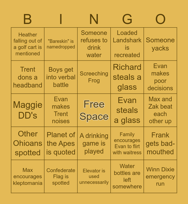 This bingo card has a free space and 100 words: Maggie Complains about seafood, Max Critiques Dinner, Max and Zak beat each other up, Human Kazoo appears, Something is called "Smokey", Richard loses something, Max/Zak suggest working out, Joe gets sunburned, Choclatini's are mentioned, Maggie is "too tired", "Vacation Joe" is name-dropped, Principal Walk, Evan complains about Jimmy Buffet, Confederate Flag is spotted, Restaurant wait time is over 90 minutes, Politics is brought up :(, Richard steals a glass, Someone starts planning next years vacation, Kelley loses Something, Joe cusses at traffic, Butterfly in the Ocean, "Second stomach" is mentioned, We get rained in, Teacher talk occurs, Heather loses something, Evan steals a glass, Someone yacks, Family encourages Evan to flirt with waitress, Cletus podcast, Trent is blamed for something, Evan makes Trent noises, Heather falling out of a golf cart is mentioned, Joe makes weather predictions, Dinner plans are disputed, Water bottles are left somewhere, Screeching Frog, Frank gets bad-mouthed, Zak throws up Cletian Snake Gang signs, The term "NASA Umbrella" is used, Mamma Mia soundtrack is played, 90's Hiphop is requested, We run out of Juice, Maggie DD's, Max makes poor decisions, Evan makes poor decisions, Someone refuses to drink water, Bucket Drinks happen, Maggie acts as a photographer, Maggie comes out of her room before 10, Elevator is used unnecessarily, Joe relinquishes driving privileges, Badass coffee is mentioned, Zak drops a football, Someone complains about being sunburnt, Max feat of strength, Lat spread, Maggie's height is mocked, Evan's height is mocked, Someone shares a dog/bruno update, Loaded Landshark is recreated, Max weaponizes Jimmy Buffet's music, Someone gets hurt on the beach, Boys wake up before 8:30am, Heather has lighting fast facebook posting, Thunder shakes the house, A speaker dies mid-function, Surf Style theme is sung, Shirtless Jogger is catcalled, Zak makes Trent noises to strangers, Cletus, Aesthetic walk takes place, Planet of the Apes is quoted, Heather and Kelley nerd out over Harry Potter, Bigfoot is spotted, Evan badmouths dolphins, Richard encourages Cletus behavior, Dolphin sighting, Trent dons a headband, Shark sighting, Jellyfish sighting, The boys play Xbox instead of touch grass, Winn Dixie emergency run, Pink Pony Club is played, A drinking game is played, Richard does the Robot, "Bareskin" is namedropped, Kelley curses Maggie for Crumbl, Micah invites girls over, Kraken shirt is found, Other Ohioans spotted, Someone says, "this will pass.", Gift is purchased for a dog, Zak says "Rizz", Max encourages kleptomania, Boys get into verbal battle, Bingo occurrence is disputed, 100% Chuck, Sleepy Chuck avoids social interaction, Banana-coladas happen and Zak gets grumpy.