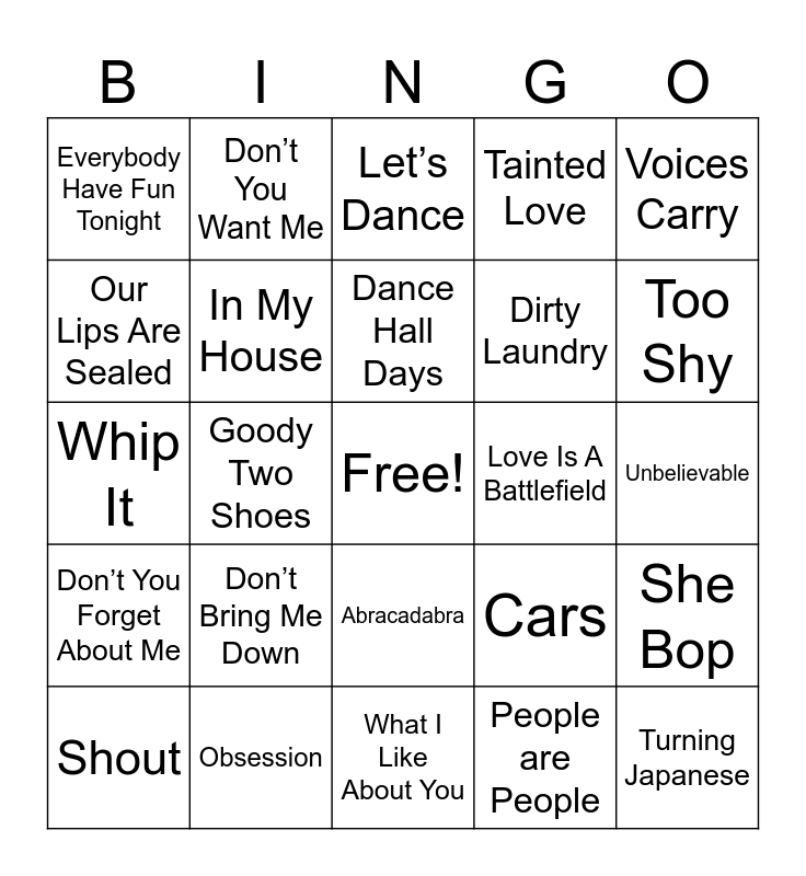 This bingo card has a free space and 34 words: I Melt with You, People are People, Any Way You Want It, Fresh, Don’t You Forget About Me, In My House, Voices Carry, Shout, Don’t You Want Me, She Drives Me Crazy, Dance Hall Days, Let’s Dance, Sussudio, White Wedding, Love Is A Battlefield, Too Shy, Obsession, Whip It, Don’t Bring Me Down, Cars, Abracadabra, Roam, Everybody Have Fun Tonight, Unbelievable, What I Like About You, Turning Japanese, Tainted Love, I Touch Myself, Dirty Laundry, Our Lips Are Sealed, Hip To Be Square, Goody Two Shoes, She Bop and Shake It Up.