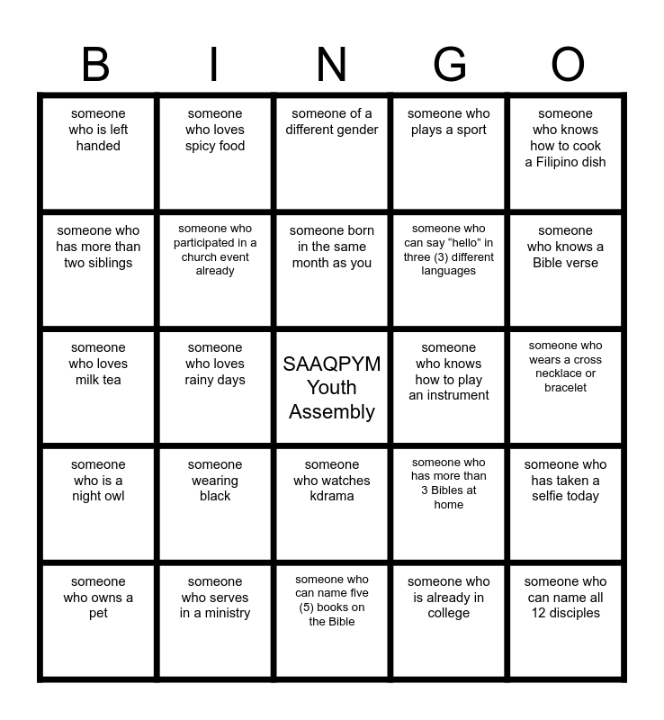 This bingo card has a free space and 24 words: someone wearing black, someone who serves in a ministry, someone born in the same month as you, someone who owns a pet, someone who knows how to cook a Filipino dish, someone who is left handed, someone who has more than two siblings, someone who loves spicy food, someone who knows how to play an instrument, someone who watches kdrama, someone who can say “hello” in three (3) different languages, someone who loves milk tea, someone who has more than 3 Bibles at home, someone who has taken a selfie today, someone who participated in a church event already, someone who is already in college, someone who wears a cross necklace or bracelet, someone of a different gender, someone who knows a Bible verse, someone who loves rainy days, someone who can name all 12 disciples, someone who is a night owl, someone who plays a sport and someone who can name five (5) books on the Bible.