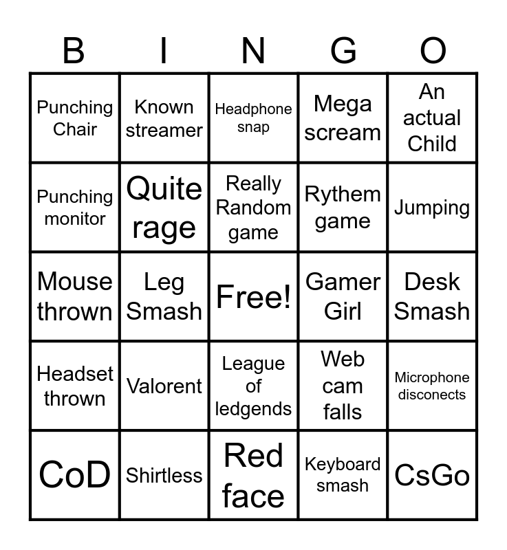 This bingo card has a free space and 24 words: Valorent, Shirtless, Really Random game, CoD, An actual Child, Punching Chair, Punching monitor, Known streamer, Gamer Girl, League of ledgends, Rythem game, Mouse thrown, Web cam falls, Microphone disconects, Quite rage, Keyboard smash, Desk Smash, Headphone snap, Jumping, Leg Smash, CsGo, Headset thrown, Mega scream and Red face.