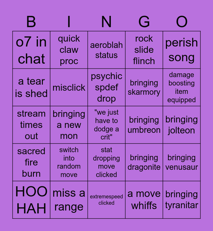 This bingo card has a free space and 46 words: switching into a 4x resisted move, bringing tyranitar, chain kill, extremespeed clicked, switch into random move, bringing ninetales, quick claw proc, shadow ball def drop, a tear is shed, opponent switches, misclick, rock slide flinch, bringing venusaur, bringing dragonite, AP boost, scizor boosts, psychic spdef drop, bringing umbreon, bringing a mon with a maxed stat, perish song, bringing a new mon, a move whiffs, o7 in chat, bringing skarmory, STALL, damage boosting item equipped, HOO HAH, mitigation quick claw, stat dropping move clicked, sacred fire burn, a TM is taught, mon falls asleep, crit mattered, crit didn't matter, bringing lapras, miss a range, bringing jolteon, berry eaten, bringing starmie, speedup used, aeroblah crit, aeroblah status, stream times out, NODDERS, equips wrong item and mon gets paralysed.