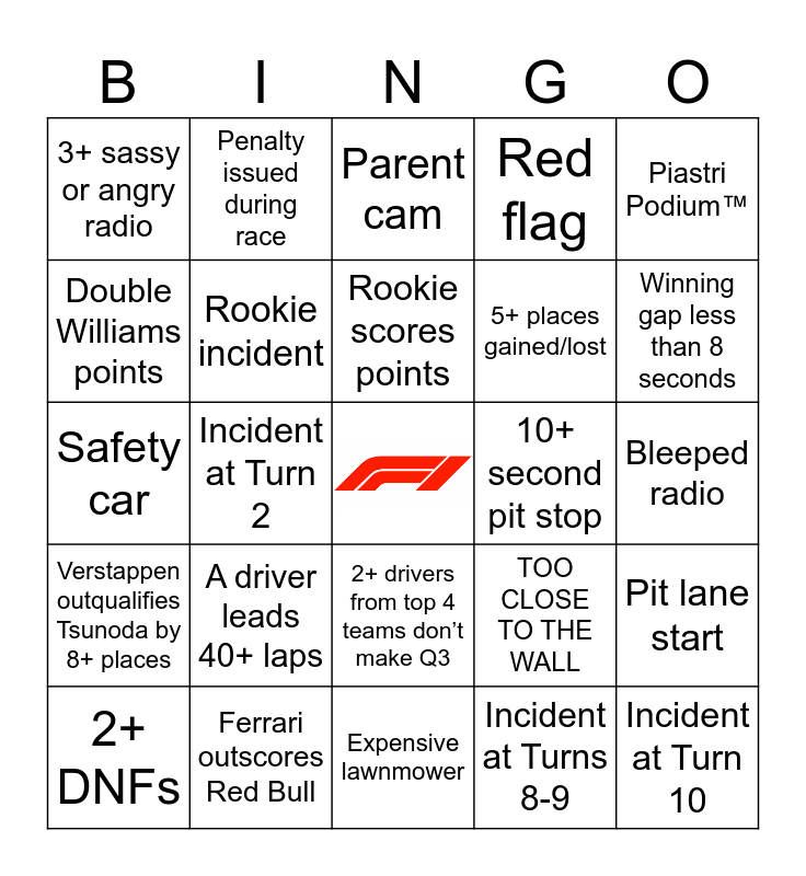 This bingo card has 1 images, a free space and 26 words: TOO CLOSE TO THE WALL, 5+ places gained/lost, Expensive lawnmower, Double Williams points, Parent cam, Penalty issued during race, Verstappen outqualifies Tsunoda by 8+ places, 10+ second pit stop, Pit lane start, Safety car, Red flag, 2+ DNFs, Ferrari outscores Red Bull, Winning gap less than 8 seconds, Polesitter does not win the race, Rookie incident, Rookie scores points, A driver leads 40+ laps, 3+ sassy or angry radio, Bleeped radio, Incident at Turns 8-9, Incident at Turn 2, Incident at Turn 10, 2+ drivers from top 4 teams don’t make Q3, Piastri Podium™️ and HAD GAS or HAD HAM in session result.