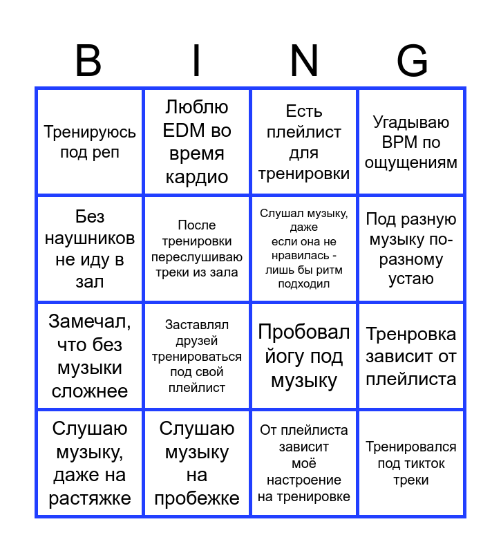 This bingo card has 16 words: Слушаю музыку на пробежке, Тренровка зависит от плейлиста, Есть плейлист для тренировки, Тренируюсь под реп, Замечал, что без музыки сложнее, Люблю EDM во время кардио, Пробовал йогу под музыку, От плейлиста зависит моё настроение на тренировке, Без наушников не иду в зал, После тренировки переслушиваю треки из зала, Слушаю музыку, даже на растяжке, Угадываю BPM по ощущениям, Заставлял друзей тренироваться под свой плейлист, Под разную музыку по-разному устаю, Слушал музыку, даже если она не нравилась - лишь бы ритм подходил and Тренировался под тикток треки.