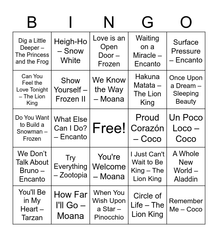 This bingo card has a free space and 40 words: Let It Go – Frozen, Do You Want to Build a Snowman – Frozen, Into the Unknown – Frozen II, Show Yourself – Frozen II, How Far I'll Go – Moana, You're Welcome – Moana, We Know the Way – Moana, I Am Moana (Song of the Ancestors) – Moana, Surface Pressure – Encanto, We Don’t Talk About Bruno – Encanto, What Else Can I Do? – Encanto, Waiting on a Miracle – Encanto, Remember Me – Coco, Un Poco Loco – Coco, Proud Corazón – Coco, Try Everything – Zootopia, Almost There – The Princess and the Frog, Dig a Little Deeper – The Princess and the Frog, Down in New Orleans – The Princess and the Frog, Love is an Open Door – Frozen, A Whole New World – Aladdin, Circle of Life – The Lion King, Hakuna Matata – The Lion King, Can You Feel the Love Tonight – The Lion King, Beauty and the Beast – Beauty and the Beast, Be Our Guest – Beauty and the Beast, Part of Your World – The Little Mermaid, Under the Sea – The Little Mermaid, Kiss the Girl – The Little Mermaid, Colors of the Wind – Pocahontas, Just Around the Riverbend – Pocahontas, You'll Be in My Heart – Tarzan, Two Worlds – Tarzan, I Just Can't Wait to Be King – The Lion King, Once Upon a Dream – Sleeping Beauty, When You Wish Upon a Star – Pinocchio, I've Got No Strings – Pinocchio, Someday My Prince Will Come – Snow White, Heigh-Ho – Snow White and Bibbidi-Bobbidi-Boo – Cinderella.