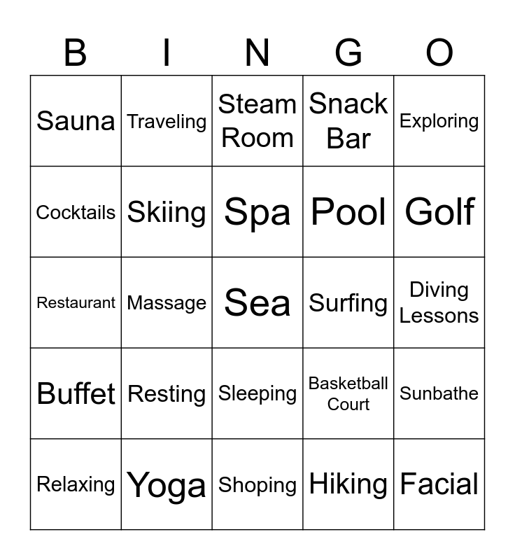 This bingo card has a free space and 24 words: Resting, Yoga, Spa, Relaxing, Exploring, Sauna, Cocktails, Traveling, Surfing, Sleeping, Pool, Restaurant, Basketball Court, Sunbathe, Skiing, Hiking, Diving Lessons, Steam Room, Golf, Massage, Facial, Buffet, Snack Bar and Shoping.