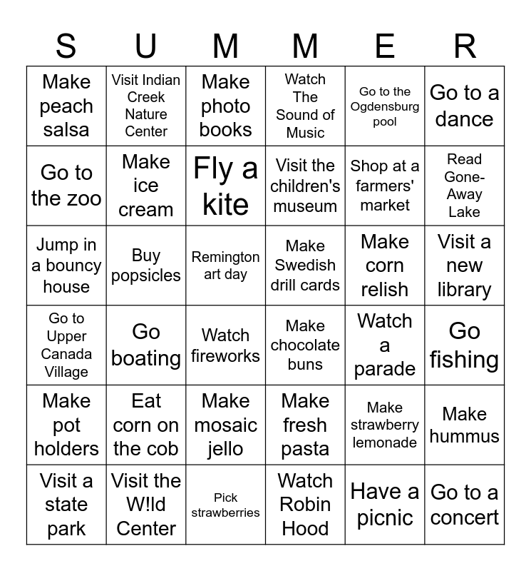 This bingo card has 36 words: Make fresh pasta, Make mosaic jello, Watch Robin Hood, Go to the zoo, Go to Upper Canada Village, Make Swedish drill cards, Make ice cream, Pick strawberries, Go to the Ogdensburg pool, Make strawberry lemonade, Read Gone-Away Lake, Watch The Sound of Music, Make hummus, Buy popsicles, Visit the children's museum, Make peach salsa, Make pot holders, Make corn relish, Jump in a bouncy house, Make photo books, Remington art day, Go boating, Make chocolate buns, Watch fireworks, Watch a parade, Visit Indian Creek Nature Center, Shop at a farmers' market, Visit the W!ld Center, Fly a kite, Go to a dance, Go to a concert, Visit a state park, Go fishing, Visit a new library, Eat corn on the cob and Have a picnic.