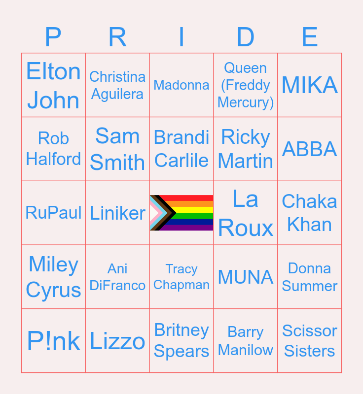 This bingo card has a free space and 36 words: Lady Gaga, Diana Ross, Cyndi Lauper, Sam Smith, MUNA, Miley Cyrus, Brandi Carlile, Janelle Monáe, MIKA, Lil Nas X, Liniker, Queen (Freddy Mercury), Ney Matogrosso, La Roux, ABBA, Elton John, Tegan and Sara, Ani DiFranco, Scissor Sisters, Madonna, Chaka Khan, Donna Summer, Lizzo, P!nk, Britney Spears, Christina Aguilera, RuPaul, Indigo Girls, Ricky Martin, Rob Halford, George Michael, Melissa Etheridge, Barry Manilow, Tracy Chapman, Janis Joplin and Michael Stipe (REM).