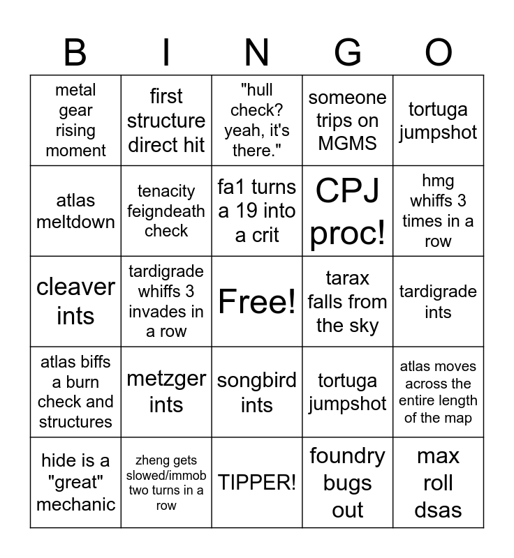 This bingo card has a free space and 24 words: metzger ints, zheng gets slowed/immob two turns in a row, fa1 turns a 19 into a crit, hide is a "great" mechanic, tortuga jumpshot, metal gear rising moment, atlas meltdown, first structure direct hit, tarax falls from the sky, songbird ints, CPJ proc!, cleaver ints, tortuga jumpshot, atlas moves across the entire length of the map, tenacity feigndeath check, foundry bugs out, tardigrade ints, "hull check? yeah, it's there.", hmg whiffs 3 times in a row, tardigrade whiffs 3 invades in a row, max roll dsas, atlas biffs a burn check and structures, someone trips on MGMS and TIPPER!.
