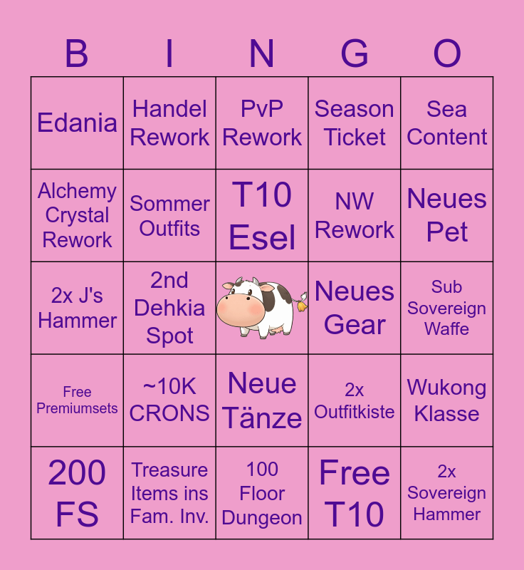 This bingo card has a free space and 24 words: 200 FS, ~10K CRONS, T10 Esel, Free T10, Sea Content, Edania, Handel Rework, PvP Rework, Neues Gear, Sub Sovereign Waffe, 2x J's Hammer, Sommer Outfits, 2x Outfitkiste, Wukong Klasse, Alchemy Crystal Rework, Treasure Items ins Fam. Inv., 100 Floor Dungeon, Season Ticket, Neues Pet, Free Premiumsets, 2nd Dehkia Spot, Neue Tänze, NW Rework and 2x Sovereign Hammer.