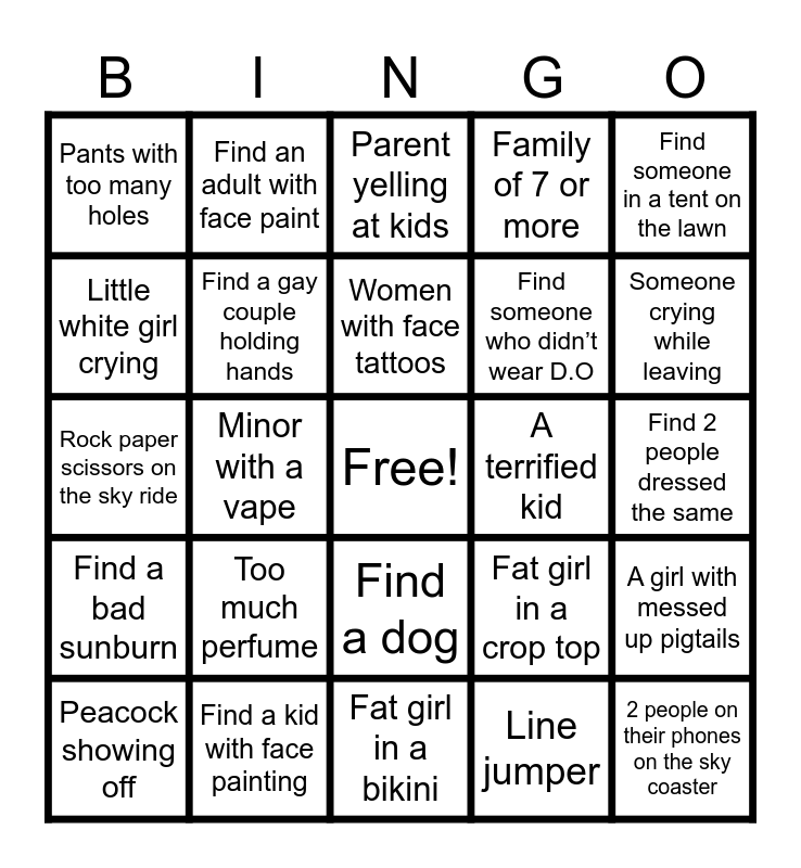 This bingo card has a free space and 27 words: Fat girl in a crop top, Winner of the biggest toy, Find someone who didn’t wear D.O, Fat girl in a bikini, Little white girl crying, Parent yelling at kids, Find an adult with face paint, Find a bad sunburn, A terrified kid, A girl with messed up pigtails, Rock paper scissors on the sky ride, Family of 7 or more, Peacock showing off, Find a kid with face painting, Someone crying while leaving, Find someone with bad makeup on, Find a gay couple holding hands, Women with face tattoos, Too much perfume, Pants with too many holes, Find 2 people dressed the same, Line jumper, Minor with a vape, 2 people on their phones on the sky coaster, Find a dog, Find someone in a tent on the lawn and Fat girl in the smoking section.