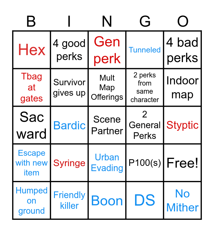 This bingo card has 52 words: Haste/Hinder Perk, Scene Partner, Same perk 3 times, Boon, Syringe, Corrupt, 4 good perks, Same perk at teammate, Tbag at gates, Own survivor perk, Survivor gives up, Conflicting perks, Free!, P100(s), DC, Mori, Mult Map Offerings, 2 General Perks, Scourge Hook, 4 bad perks, Bardic, DS, Hex, 2 perks from same character, Gen Regression, No Mither, Double Exhaust, Invocation, Indoor map, 4k, Escape, Tunneled, Slug, BNP, Get own killer perk, Gen perk, Friendly killer, Flashbang/cracker save, Ghoul, Witcher Skin, Hatch Escape, Styptic, Escape with new item, NOED, Urban Evading, Close hatch, TTV(live), Sac ward, Anniversary Offering, Hidden Offering, Humped on ground and Survivor Booty Slaps.